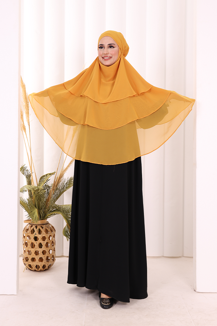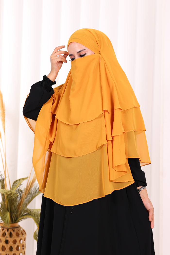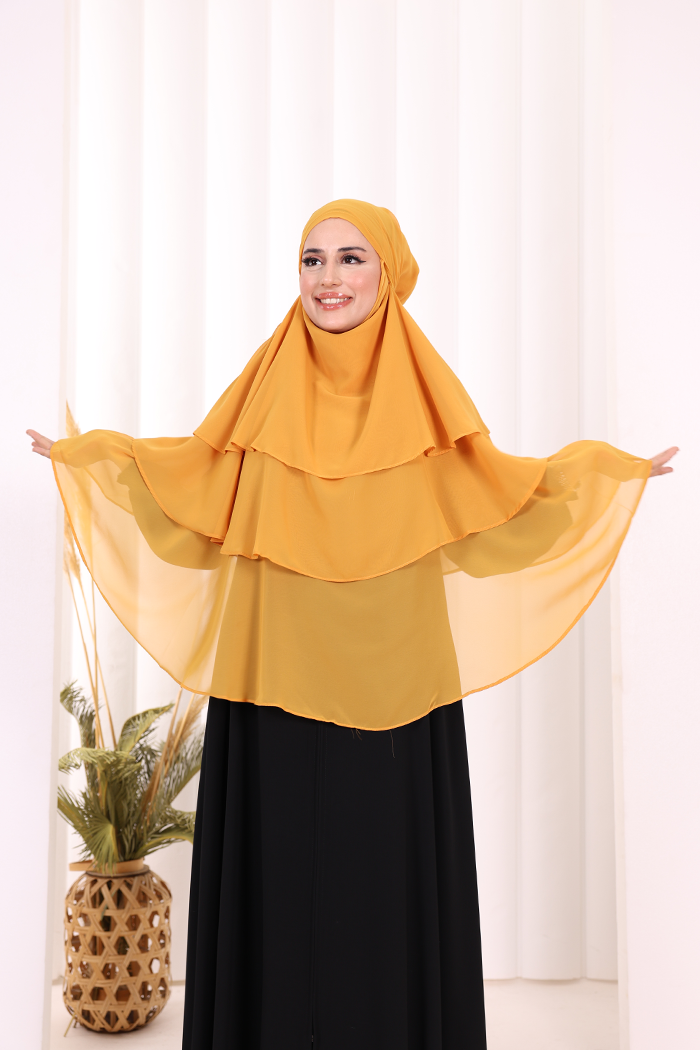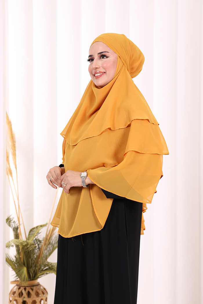 Peçeli 3 Katlı Şifon Sufle Şal 6012 Hardal