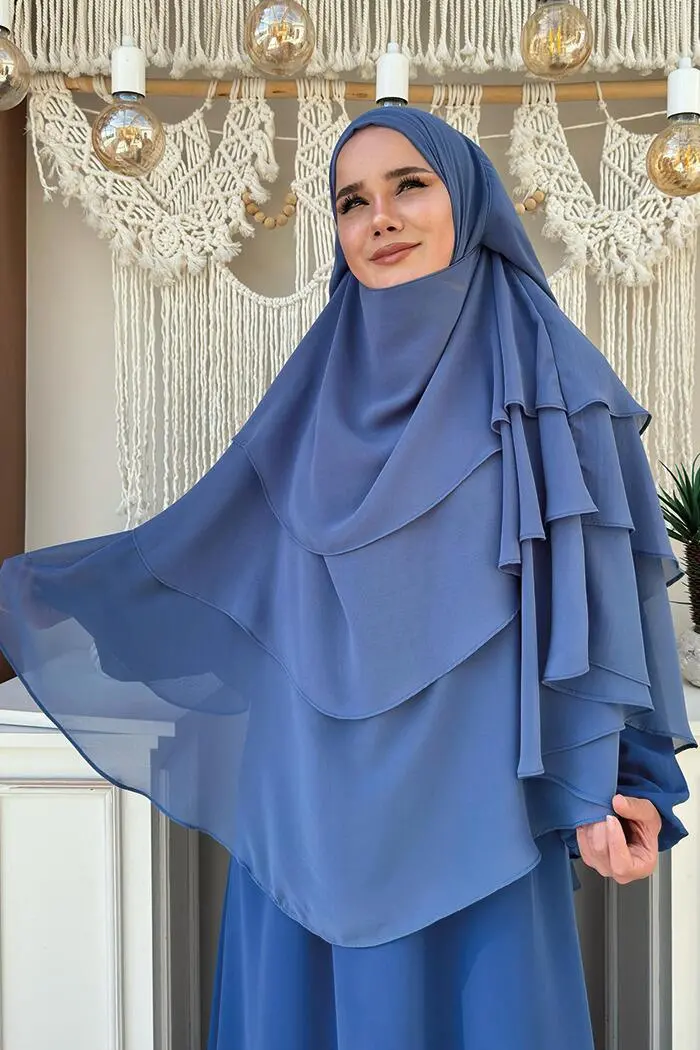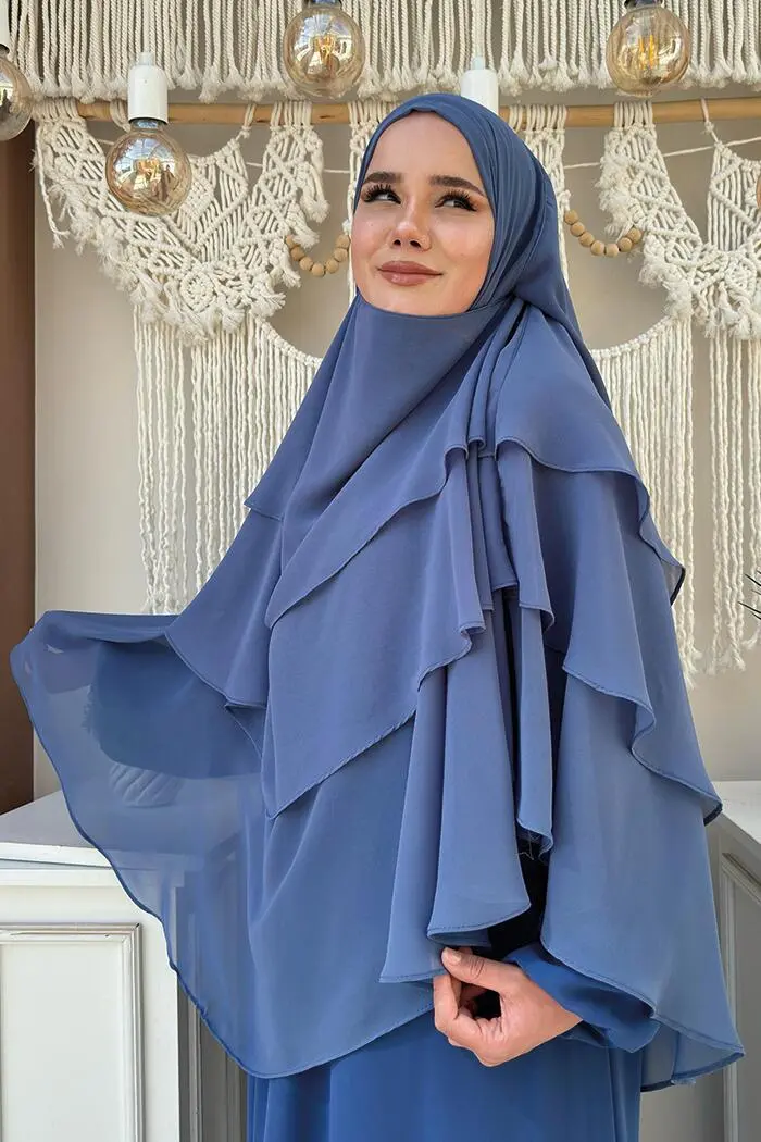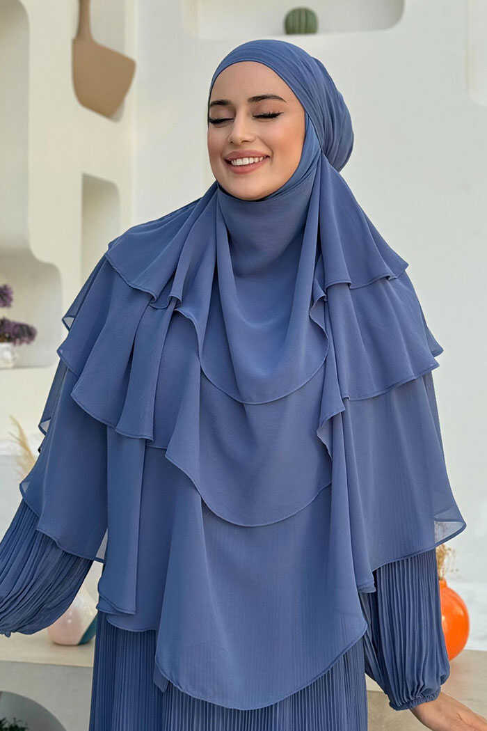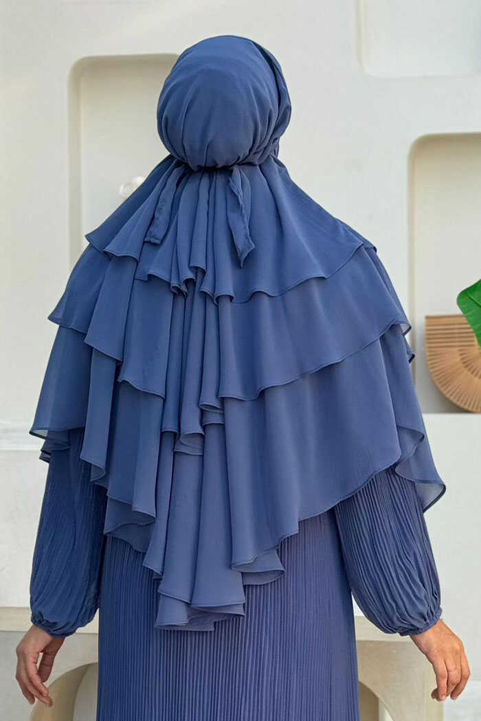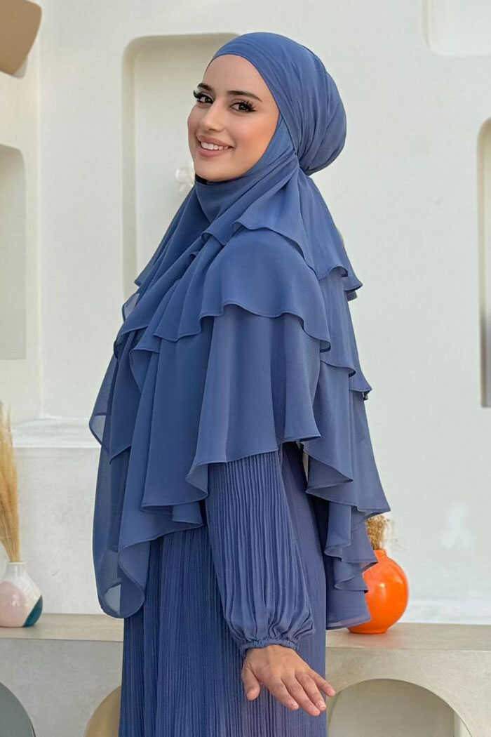 Peçeli 3 Katlı Şifon Sufle Şal 6012 İndigo