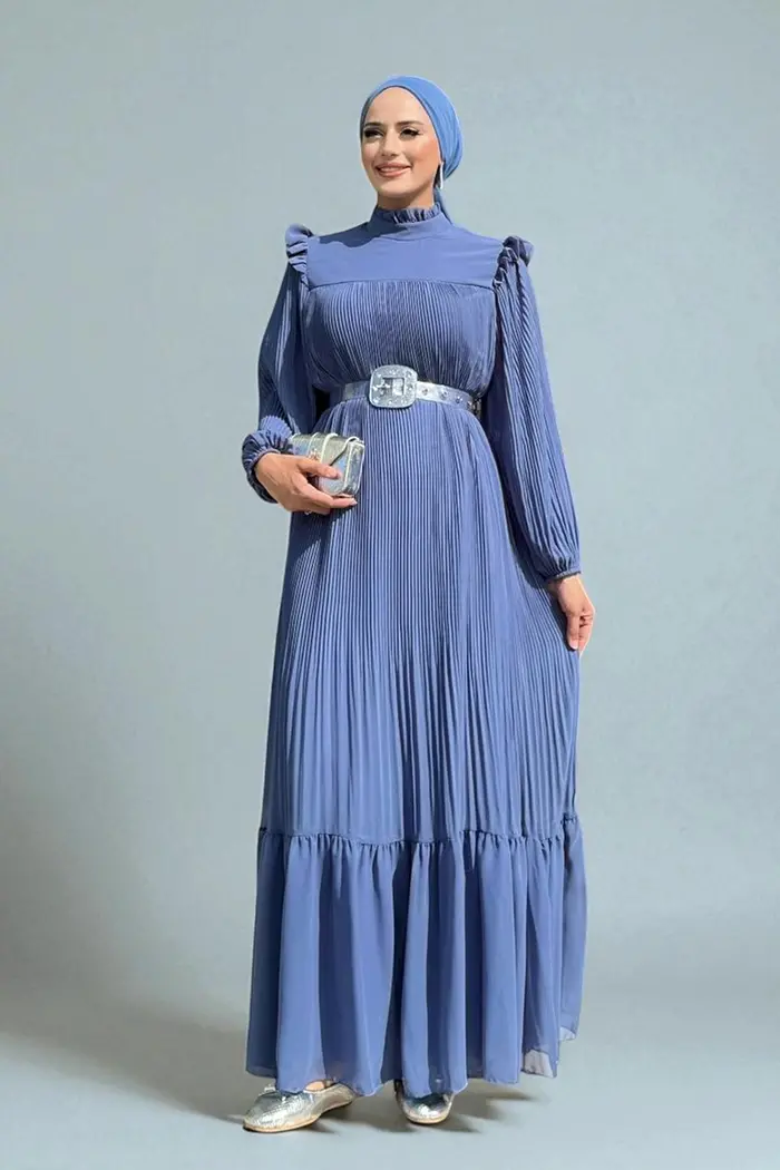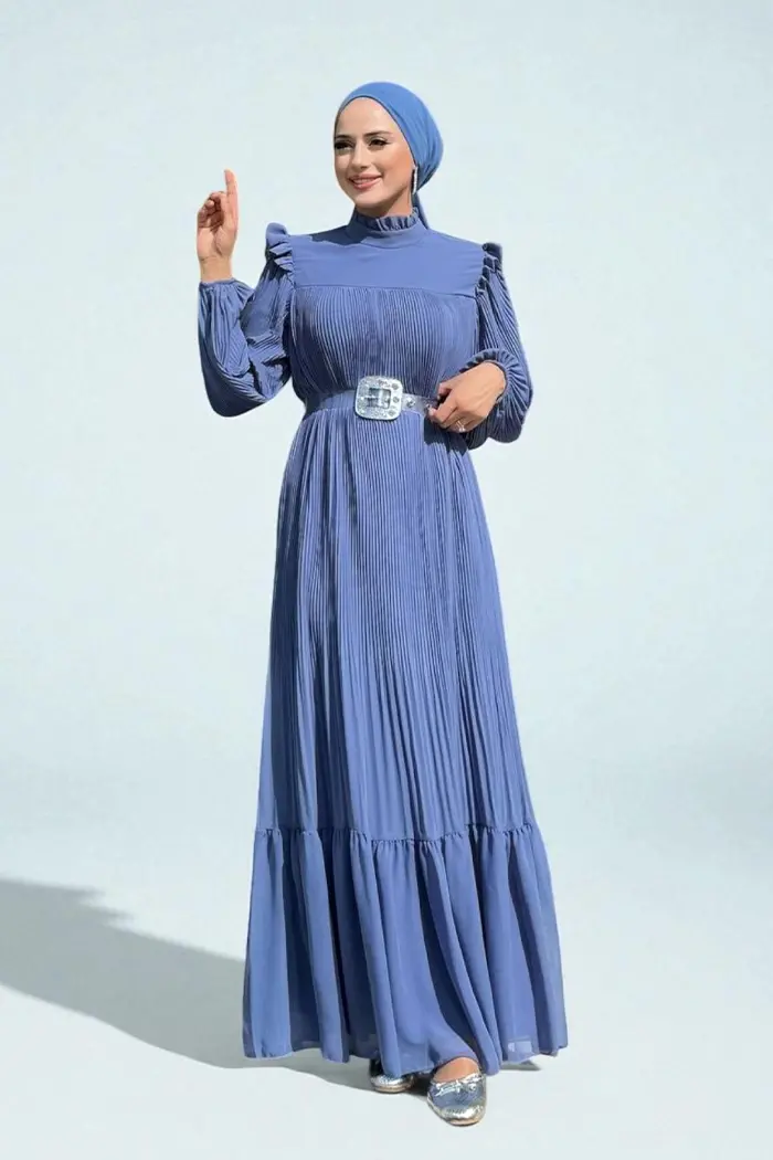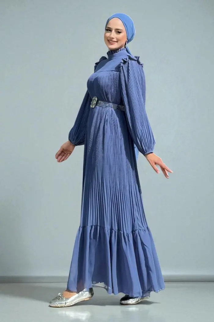 Piliseli Fırfır Görünümlü Bel Kuşaklı Şifon Elbise 3628 İndigo