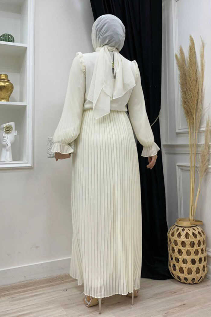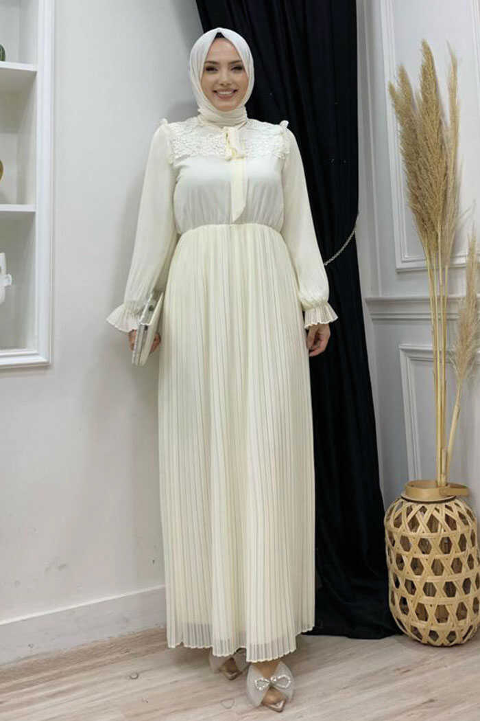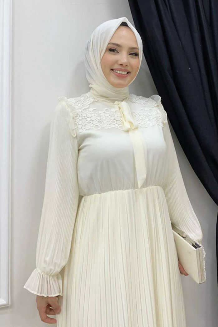 Piliseli Omuz Kısmı Dantel Görünümlü Yaka Detay Elbise 3726 Ekru