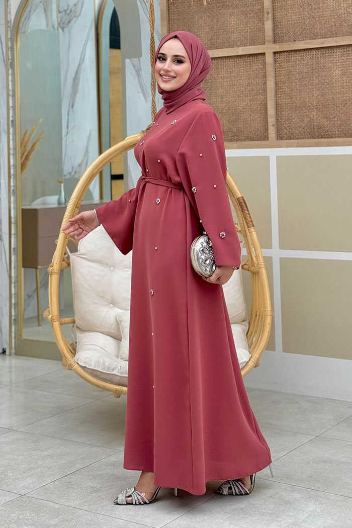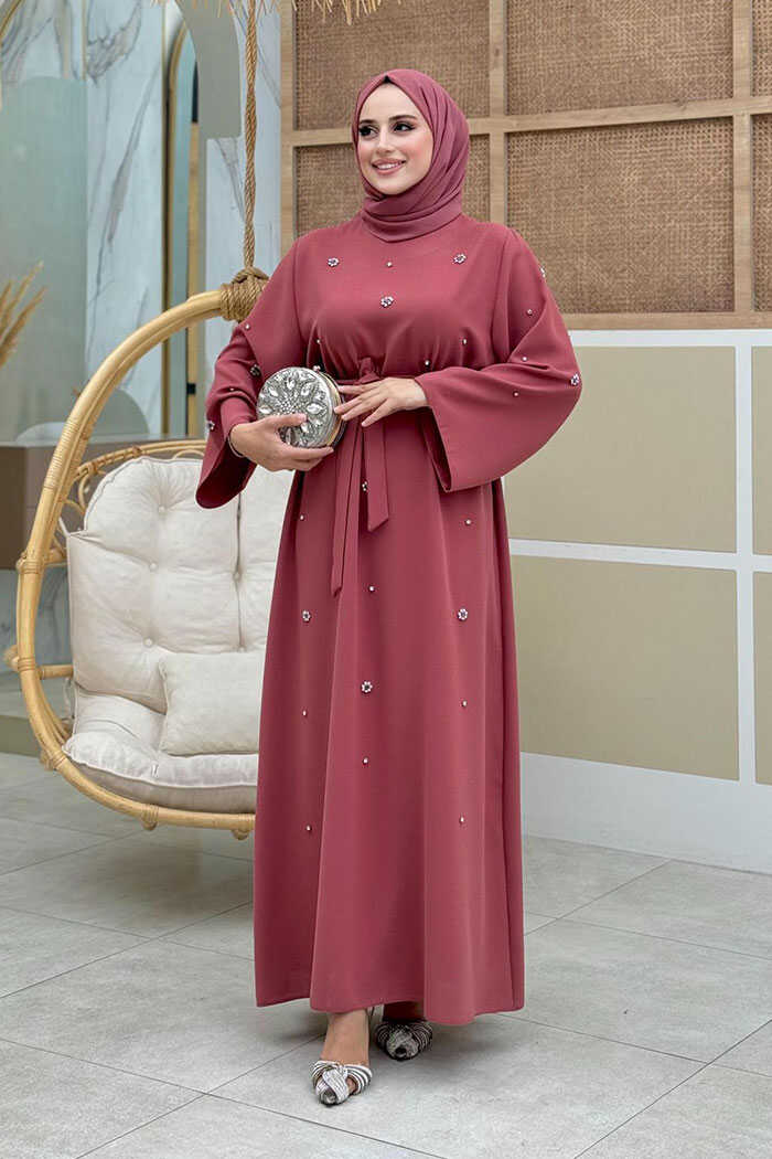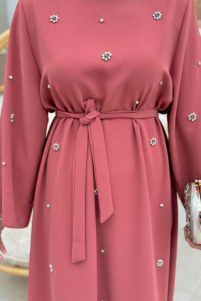 Taş Detaylı Bel Kuşaklı Elbise 3797 Gül Kurusu