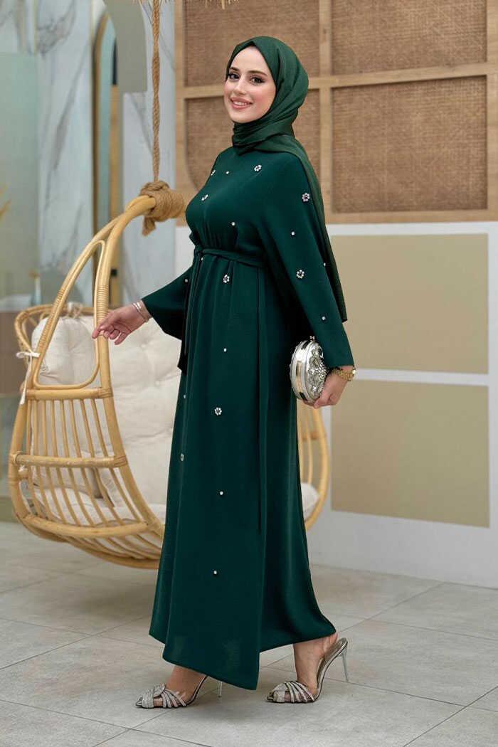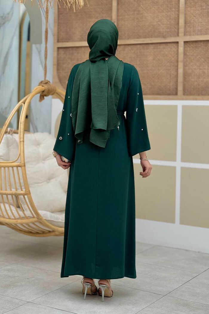 Taş Detaylı Bel Kuşaklı Elbise 3797 Zümrüt