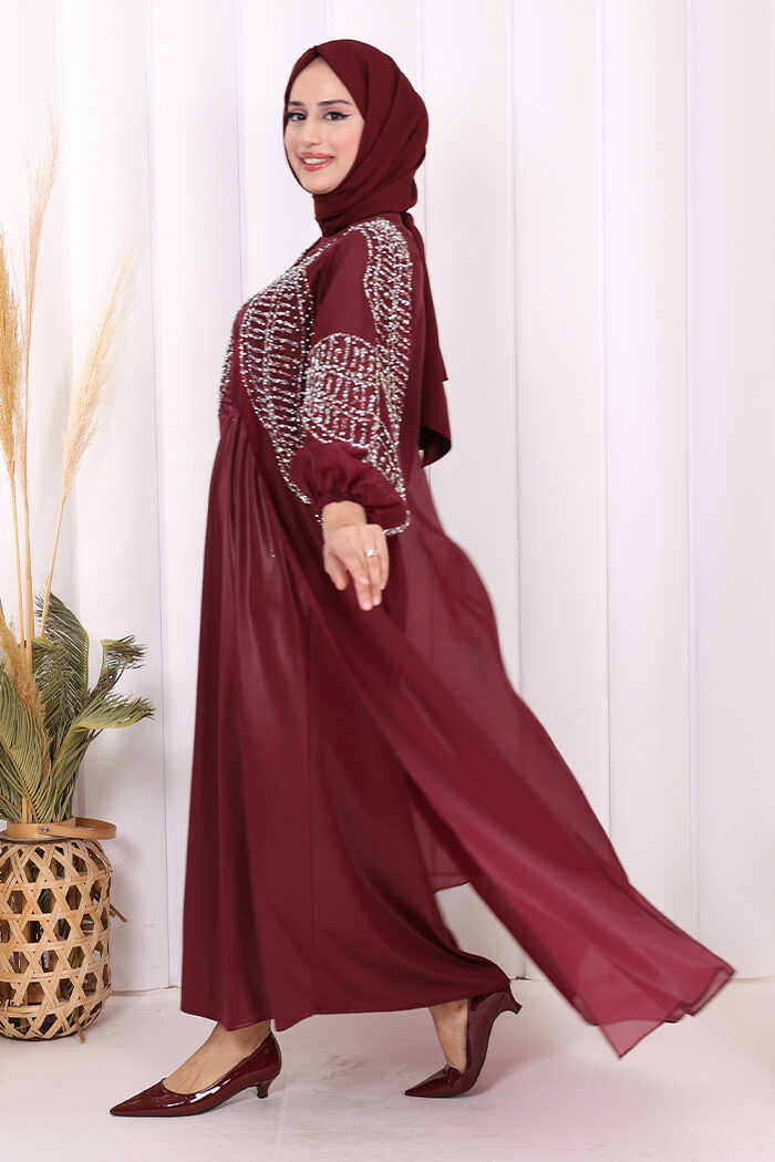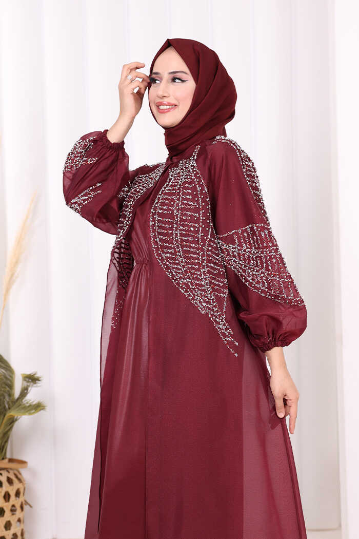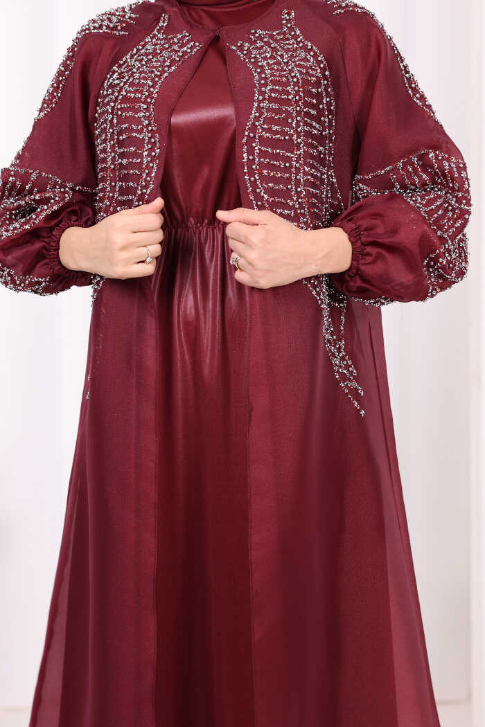 Taş Detaylı Elbise Abaya Takım 3943 Bordo