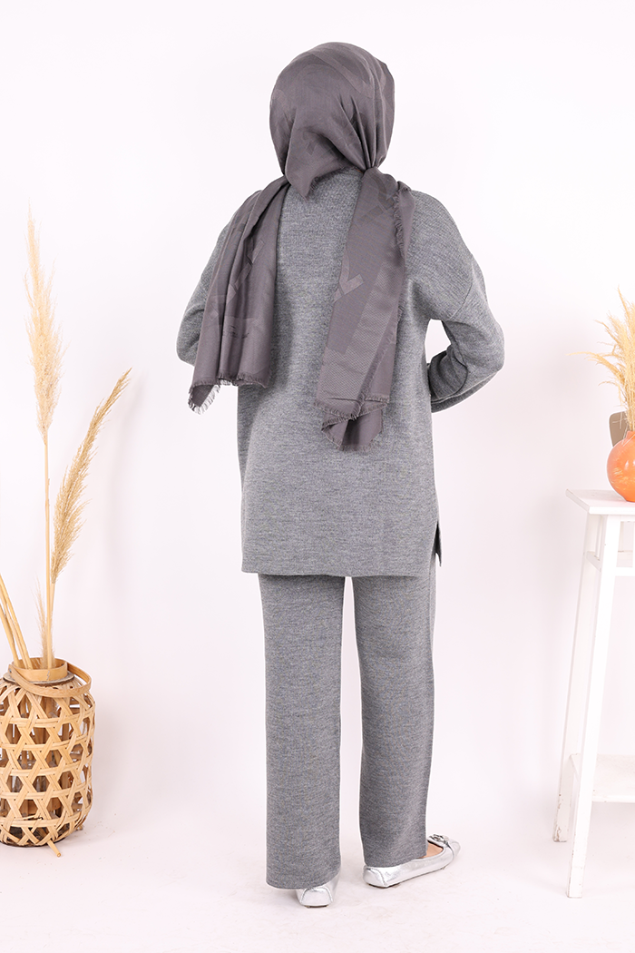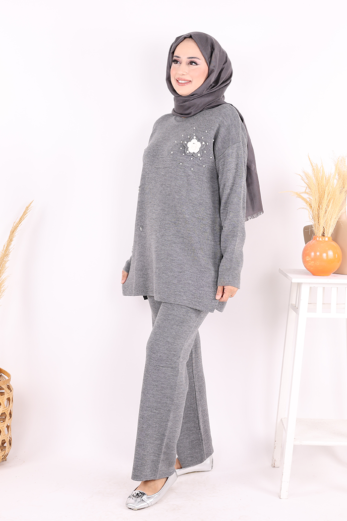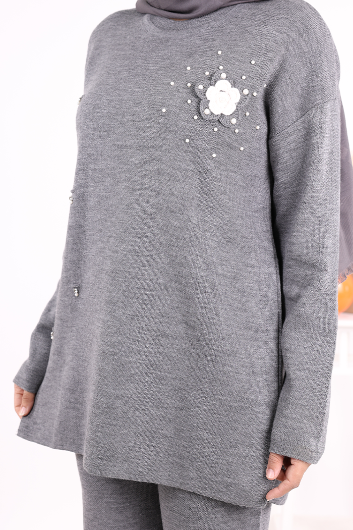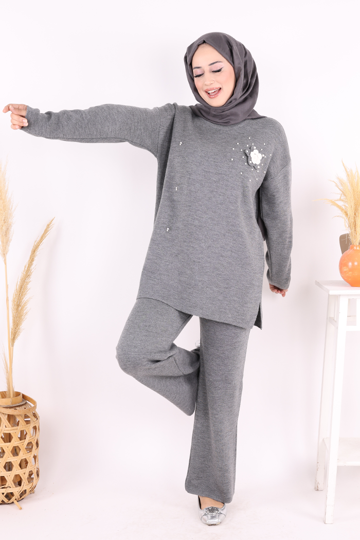 Taş ve Çiçek Detaylı Triko Takım 1655 Antrasit