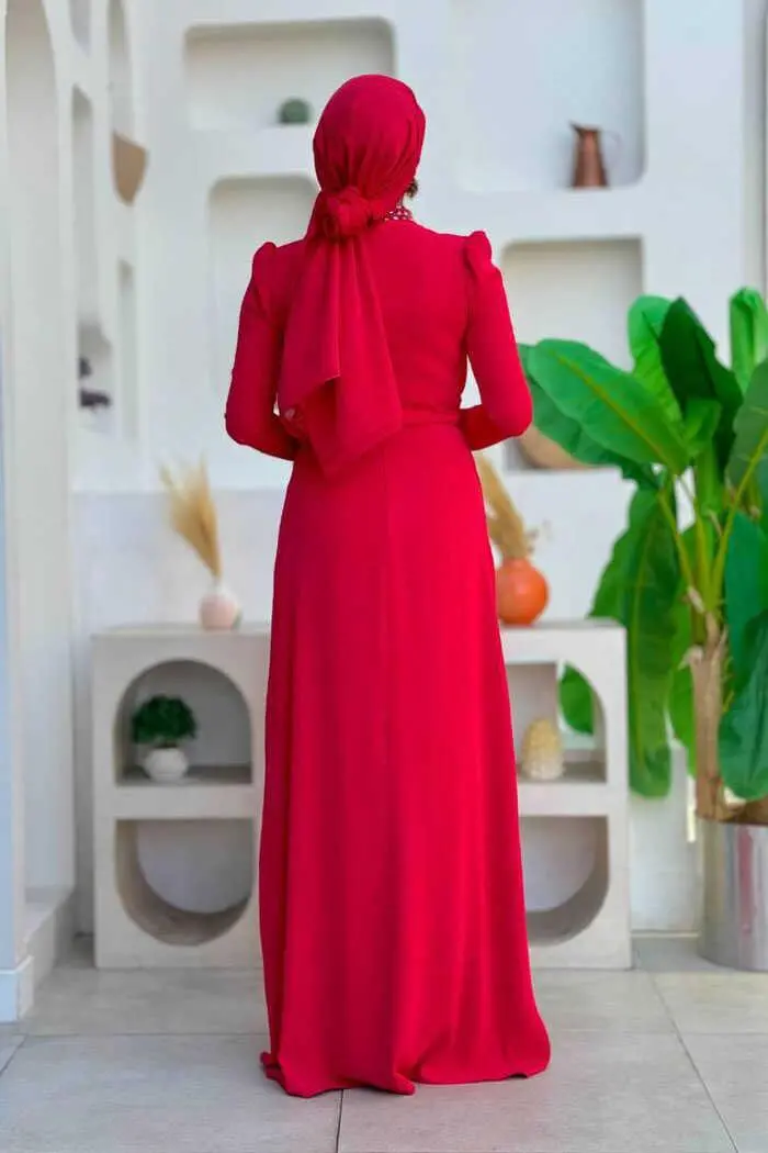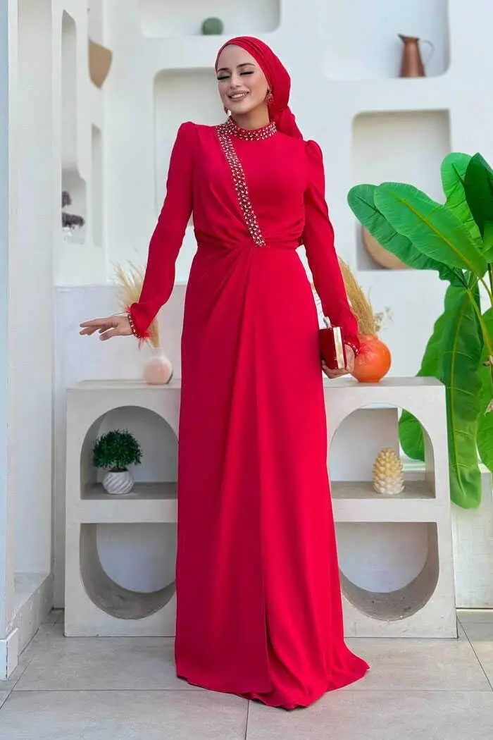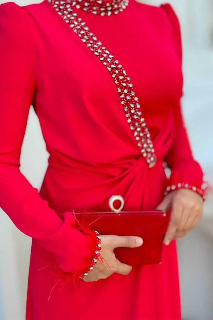 Taş ve Tüy Detaylı Abiye 7021 Kırmızı