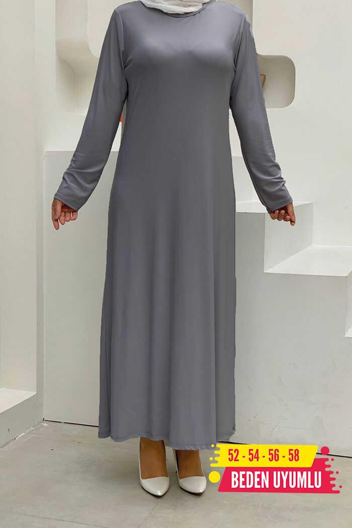 XXL Büyük Beden Düz Bisklet Yaka Uzun Kol İç Sandy Elbise 3202-3 Gri